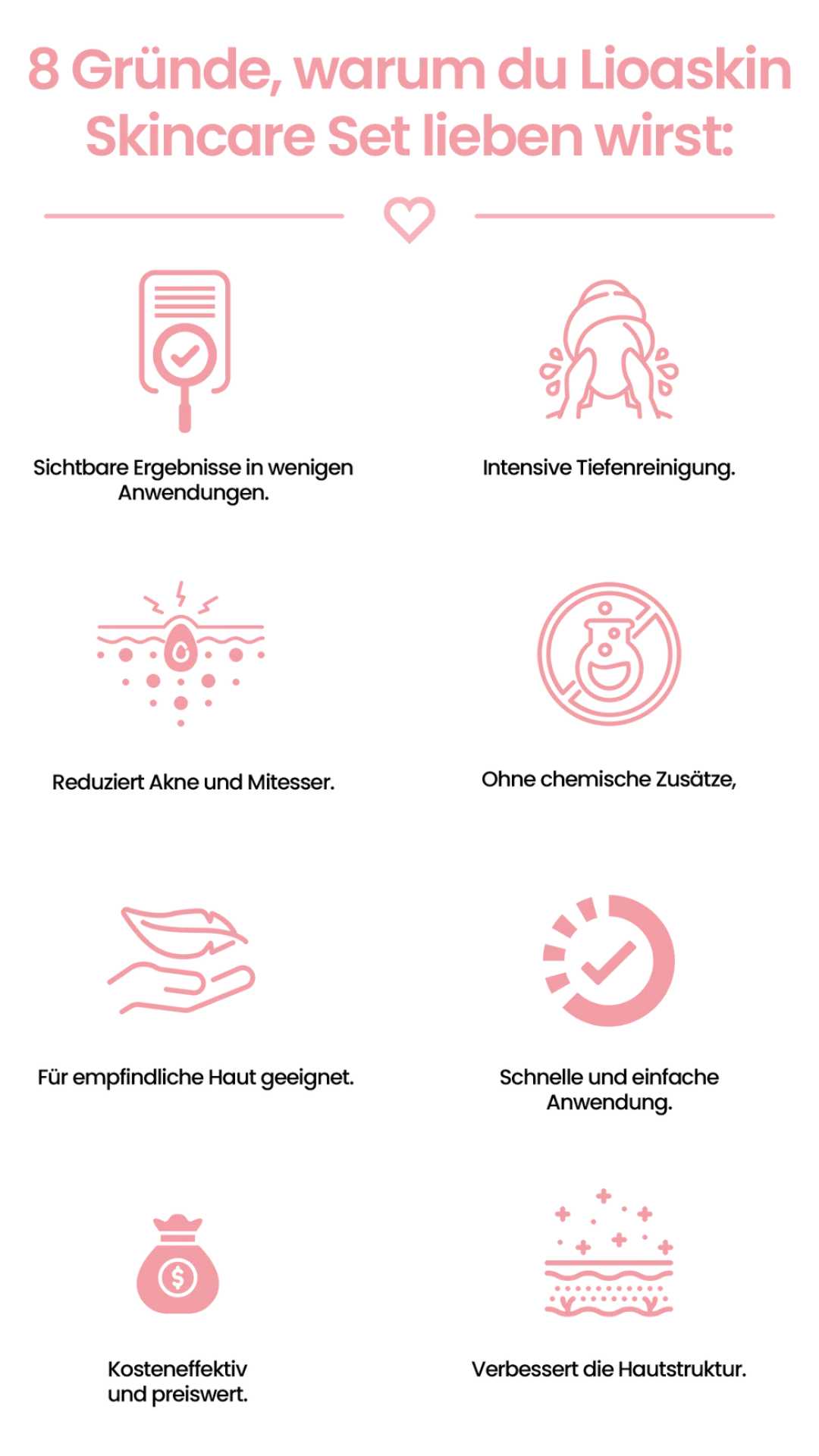 Dann ist unser Skincare Set genau das Richtige für dich! Dank innovativer Technologie und tiefenwirksamer Reinigung kann dein Hautbild bereits nach kurzer Zeit frischer und gepflegter wirken – ganz ohne großen Aufwand.